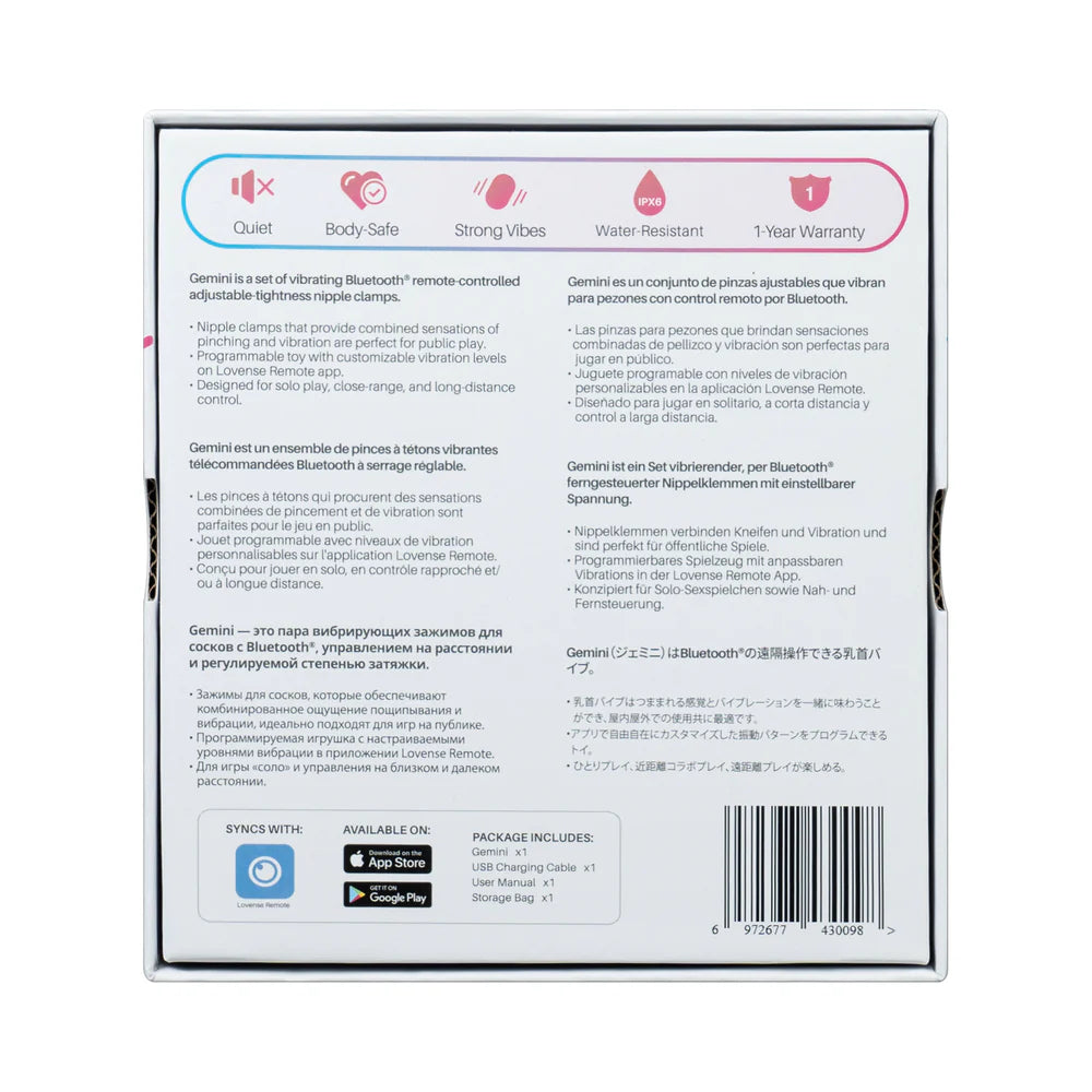 Meet Gemini - the world's first app-controlled adjustable vibrating nipple clamps. Wear Gemini however you want. Carry them discreetly and go out for new adventures. From foreplay, roleplay, to light BDSM, you can incorporate our nipple clamps into your routine with Lovense Remote app! Enjoy the perfect combination of clamps and vibrations.