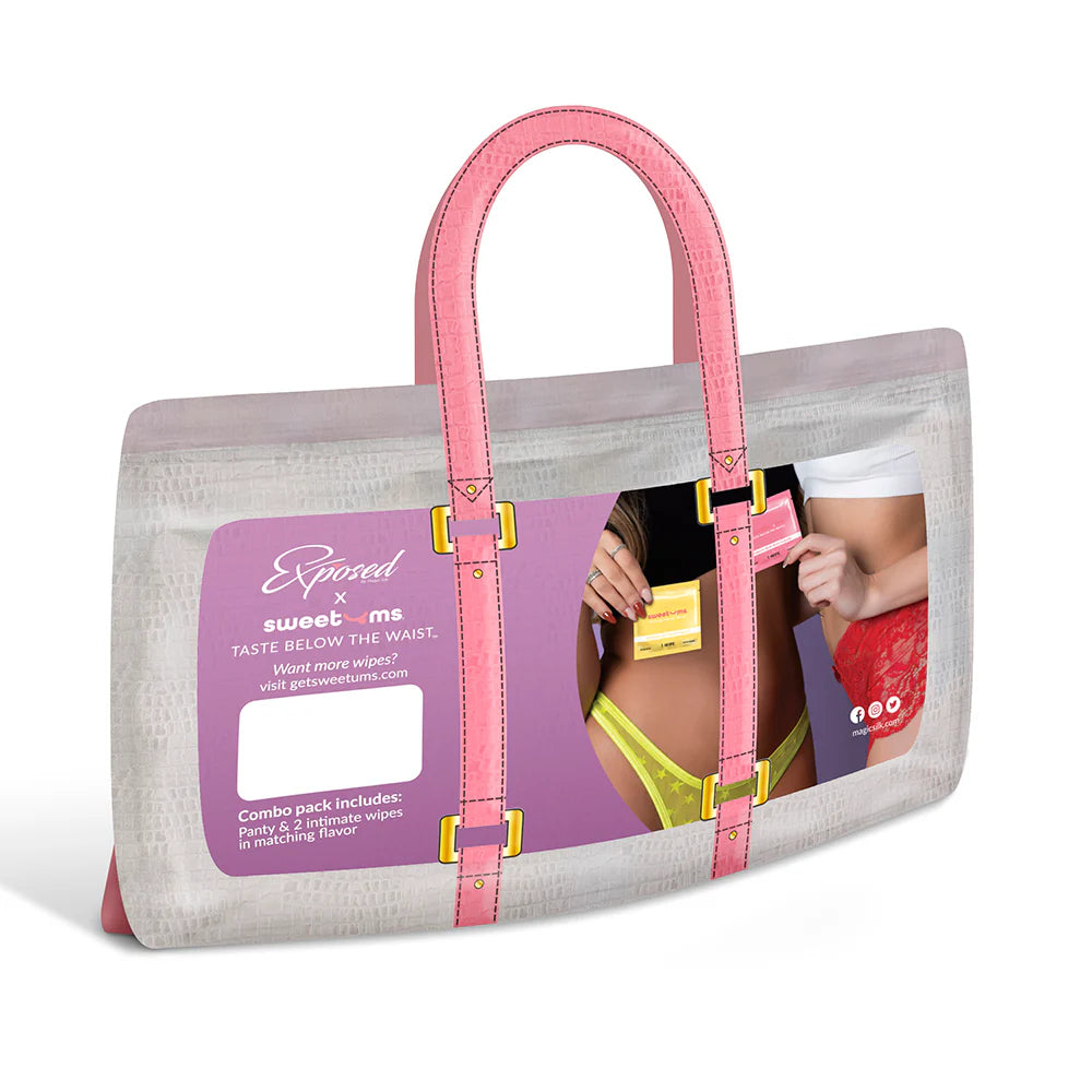 From the Exposed Lingerie and Sweetums collaboration, the Cheeky Hipster Boy Short features sheer stretch mesh, scalloped lace trim, and a satin bow tie. This playful and flirty boy short is paired with two packets of Grape-flavored Sweetums pH-balanced intimate wipes, offering a perfect combination of comfort and deliciousness.