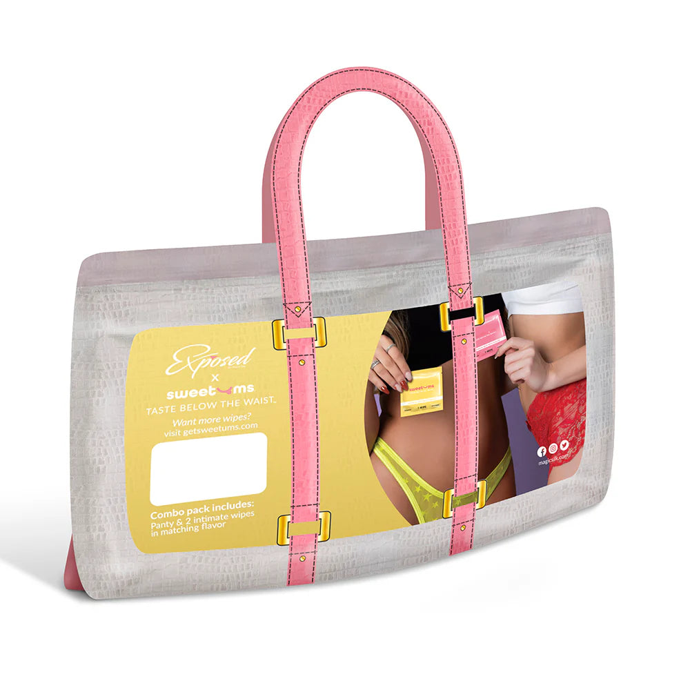 Turn up the heat with this Exposed Lingerie & Sweetums collab. This women's underwear includes a high leg, high waist micro tanga featuring a cheeky cut with star details and a playful high leg style. Crafted in stretchy neon chartreuse mesh, it's paired with 2 packets of Pina Colada flavored Sweetums pH-balanced intimate wipes for extra fun and freshness.